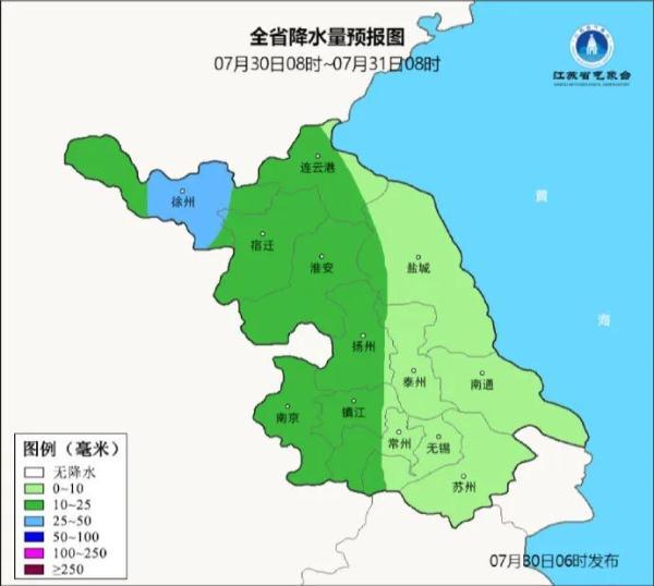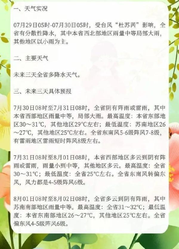 7月30日8时至7月31日8时,江苏阴有阵雨或雷雨,其中本省西部地区雨量中等,局部大雨。全省东南风5~6级阵风7~8级,有雷雨地区雷雨短时阵风8级左右。
