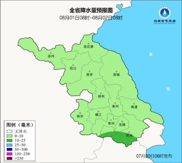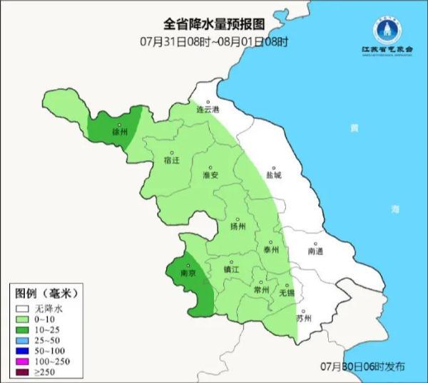 7月31日8时至8月1日8时,江苏西部地区多云到阴有阵雨或雷雨,雨量小到中等,其他地区多云。