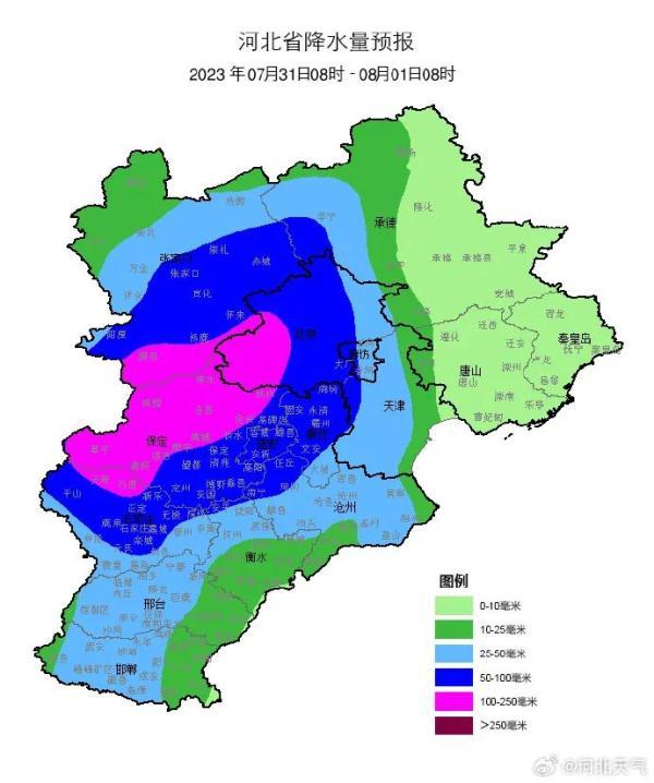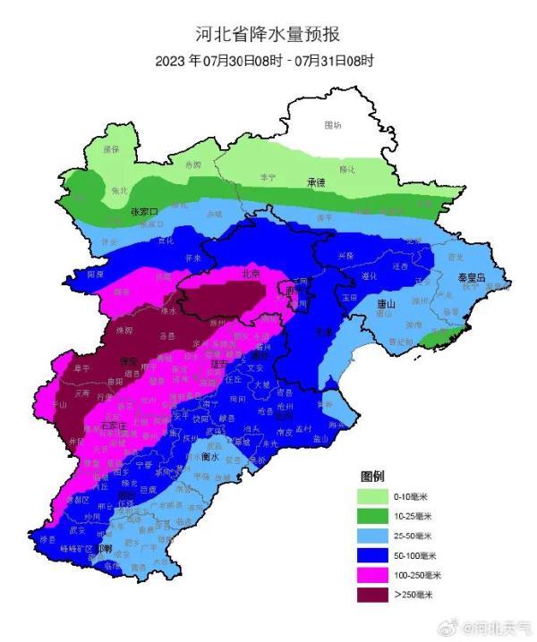 今天白天到夜间,全省阴,张家口中南部、承德南部、唐山、秦皇岛和保定、廊坊及以南地区有大雨到暴雨,其中张家口南部、保定、雄安新区、廊坊北部、石家庄、邢台西部、邯郸西部的部分地区有大暴雨,个别地点有特大暴雨,其他地区有小到中雨。最高温度,张家口、承德南部、保定西北部21~25℃,其他地区26~30℃。最低温度,张家口、承德、秦皇岛北部、保定西部16~22℃,其他地区23~25℃。