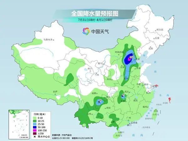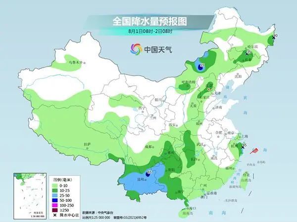 后天(8月1日),内蒙古中部、吉林中部、贵州西部、广西西部、云南、浙江东部等地的部分地区有中到大雨,局地暴雨(50~65毫米)。