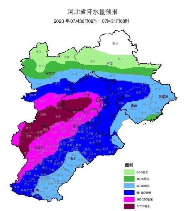 据气象台最新预报,7月30日14时至31日14时,河北大部有大到暴雨,其中,河北中部沿山地区等地部分地区特大暴雨(250~350毫米)。
