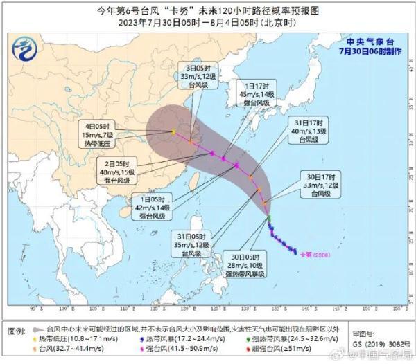 预计,“卡努”将以每小时20至25公里的速度向北偏西方向移动,31日在琉球群岛附近海域转向西北方向移动,31日夜间至8月1日早晨进入东海,逐渐向浙江沿海靠近,强度逐渐增强,最大强度可达强台风级(45至50米/秒,14至15级)。