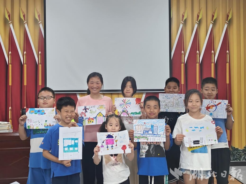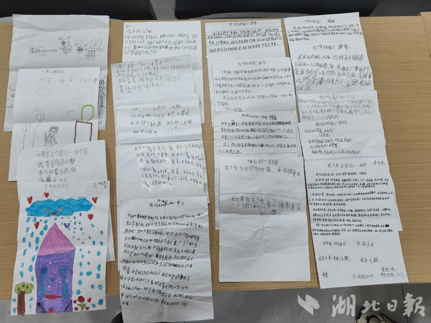 7月27日上午,在云梦县吴铺镇长塘村“希望家园”站点,来自湖北第二师范学院学优师友服务队的志愿者们为小朋友们带来一场“跨越时空”的奇妙之旅,以10年为期限,大小朋友们纷纷展现天马行空的想象力,用笔写下给自己的信,用颜料描绘出对未来家乡景象的畅想。