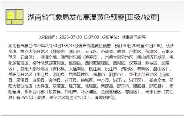 湖南省气象台2023年7月30日15时37分发布高温黄色预警:预计30日20时至31日20时,长沙全境、株洲大部分地区(醴陵市、渌口区、天元区、茶陵县、攸县、芦淞区、荷塘区、云龙示范区、石峰区)、湘潭全境、湘西州东部(泸溪县)、常德大部分地区(德山经济开发区、桃花源管理区、柳叶湖旅游度假区、桃源县、西洞庭管理区、西湖区、汉寿县、鼎城区、武陵区)、益阳大部分地区(安化县、大通湖区、桃江县、沅江市、资阳区、高新区、赫山区)、岳阳部分地区(平江县、湘阴县、屈原管理区、临湘市、汨罗市)、怀化大部分地区(沅陵县、辰溪县、麻阳县、溆浦县、芷江县、鹤城区、中方县、洪江市、洪江区)、娄底全境、邵阳大部分地区(大祥区、双清区、经开区、北塔区、新邵县、邵东市、隆回县、邵阳县)、衡阳全境、永州西北部(东安县、祁阳市、冷水滩区、金洞管理区、零陵区),郴州北部(安仁县)有35℃以上高温,局部地区将达37℃以上,请做好防范。