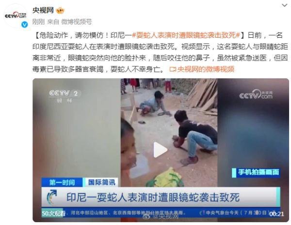 日前,一名印度尼西亚耍蛇人在表演时遭眼镜蛇袭击致死。视频显示,这名耍蛇人与眼镜蛇距离非常近,眼镜蛇突然向他的脸扑来,随后咬住他的鼻子,虽然被紧急送医,但因毒素已导致多器官衰竭,耍蛇人不幸身亡。