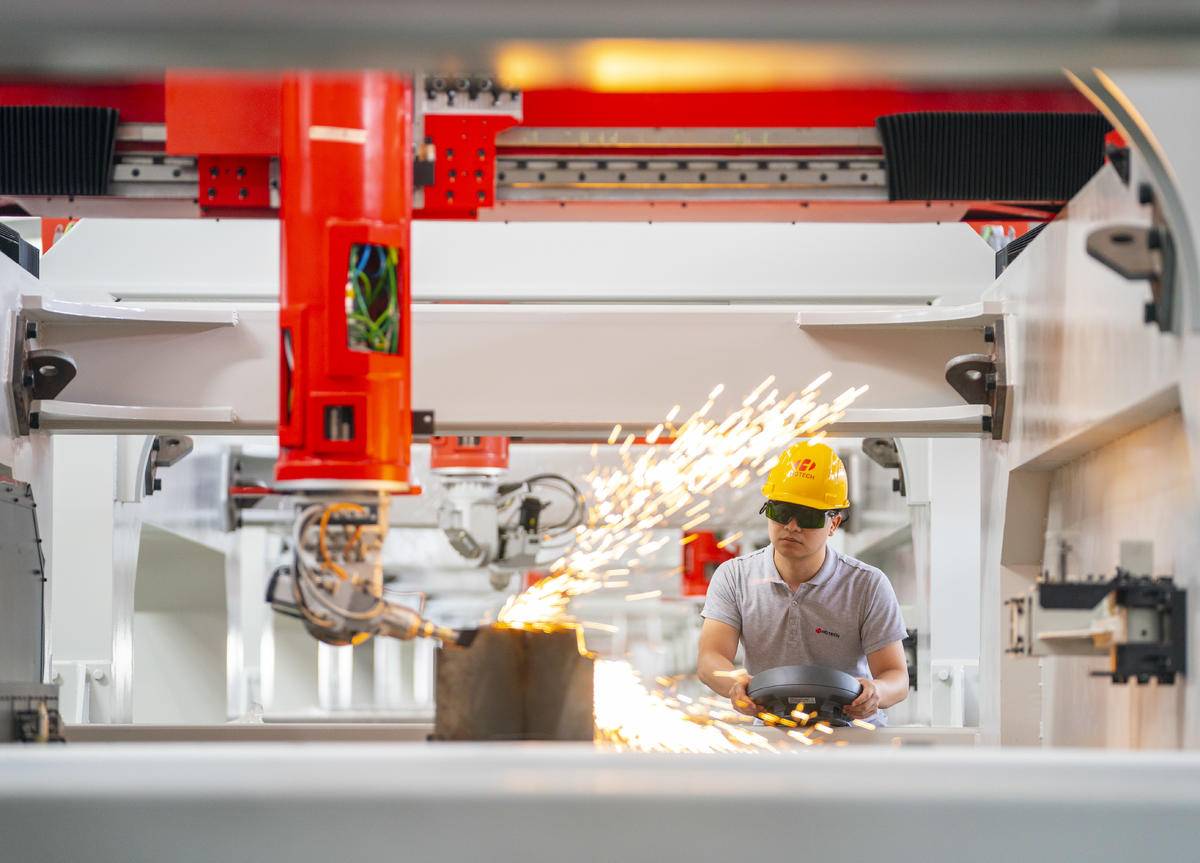 位于武汉新城的华工科技智能装备产业园(葛店园区),在国内最大的三维五轴激光切割机产线上,工作人员正加紧组装、调试订单设备。 (湖北日报全媒记者 魏铼 通讯员 俞智君 摄)