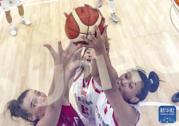 ↑中国队球员唐子婷(前右)在比赛中拼抢。新华社记者 胡超 摄