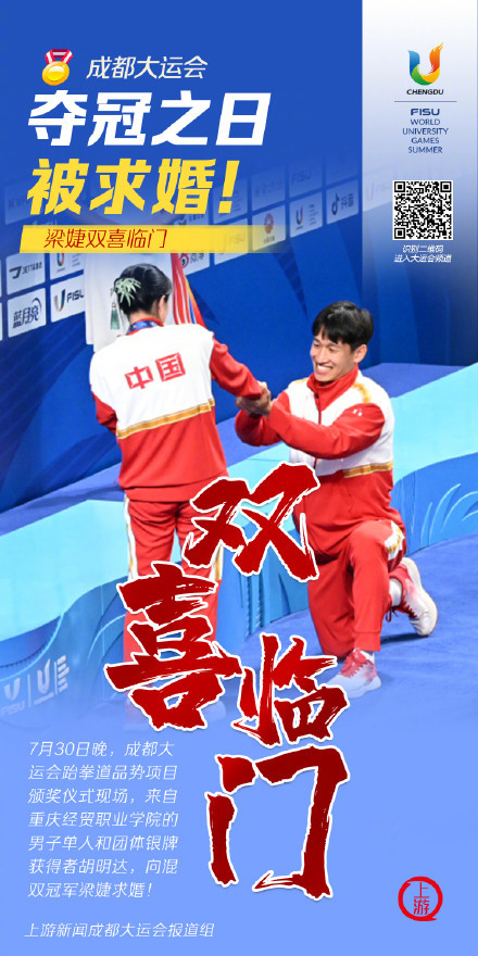 7月30日下午,成都大运会跆拳道品势项目颁奖仪式现场,来自重庆经贸职业学院的男子单人和团体银牌获得者胡明达,向混双冠军梁婕求婚!(上游新闻成都大运会报道组)