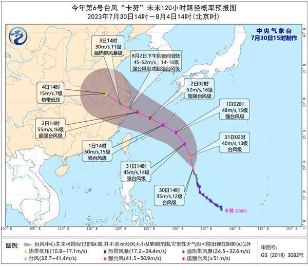 “卡努”最大可能在8月2日下午至夜间,登陆我国浙江沿海,登陆时强度较强,或以强台风或超强台风级别登陆。