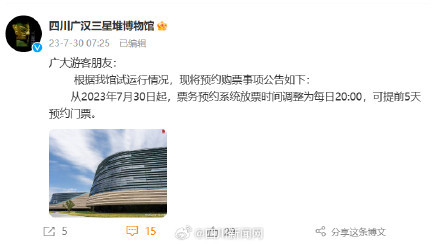 日前,三星堆博物馆新馆开启试运行。有计划前往的小伙伴们注意啦!四川广汉三星堆博物馆官方微博发布公告,从2023年7月30日起,三星堆博物馆票务预约系统放票时间调整为每日20:00,可提前5天预约门票。