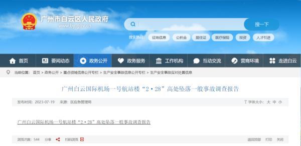 调查报告显示,2023年2月28日10时19分许,广州白云国际机场一号航站楼东三连廊17号转盘处发生一起高处坠落事故,造成1人死亡,直接经济损失100.39万元。