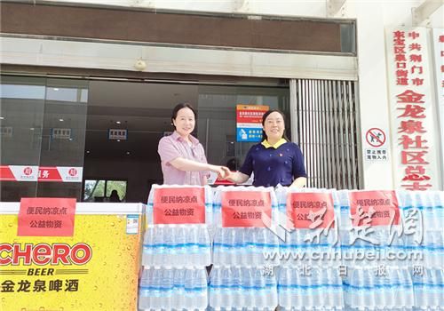 荆楚网(湖北日报网)讯(通讯员朱惊荆)连日来,荆门城区持续高温闷热天气,盛夏的烈日炙烤着大地,给坚守在一线岗位工作的人员带来了严峻的“烤”验。为了切实做好防暑降温工作,确保夏季生产安全,东宝区泉口街道金龙泉社区与大党委成员单位金龙泉啤酒集团有限公司携手共建“便民纳凉点”。7月28日上午,金龙泉集团为“便民纳凉点”捐赠了爱心冰箱和矿泉水,为户外工作人员带来“清凉”,体现了企业的社会责任担当。