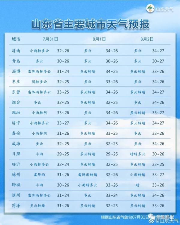 【未来三天山东雨水继续相伴 31日大部地区有小到中雨】预计31日鲁南、鲁中和鲁西北地区有小到中雨局部大雨转多云;8月1—2日我省中西部地区天气多云间阴有雷雨或阵雨,其他地区天气晴间多云。