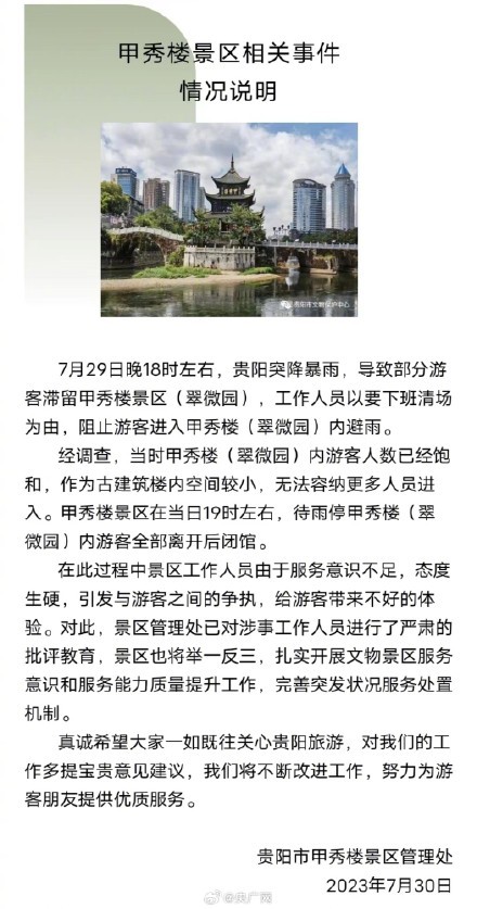 近日,网传贵州省贵阳市甲秀楼景区下大雨,工作人员却以马上下班为由,拒绝游客进景区内躲雨,引发网友热议。
