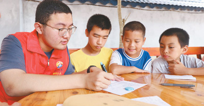 图为7月30日,大学生志愿者在岑巩县水尾镇马家寨村为当地学生解答学习上的疑问。
