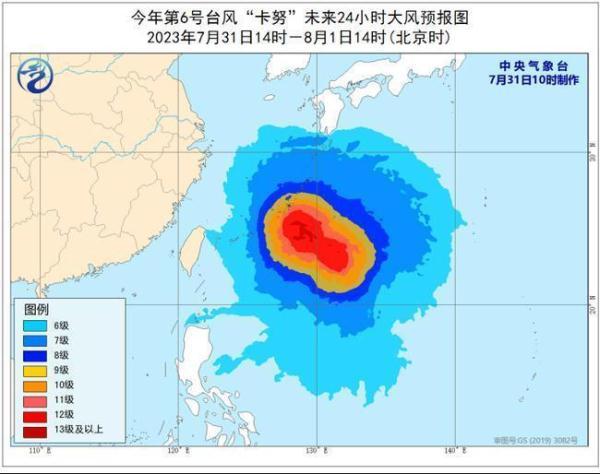 中央气象台7月31日10时继续发布台风预报:今年第6号台风“卡努”(KHANUN)已于今天(7月31日)上午由台风级加强为强台风级,8点钟其中心位于琉球群岛那霸市东南方向约630公里的西北太平洋洋面上(北纬22.1度、东经132.0度),中心附近最大风力有14级(42米/秒),中心最低气压955百帕,七级风圈半径320-400公里,十级风圈半径120-140公里,十二级风圈半径60-90公里。