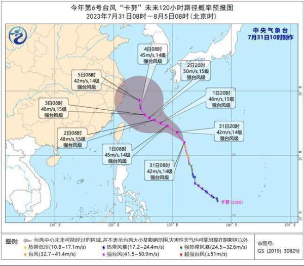 预计,“卡努”将以每小时15-20公里的速度向北偏西转西北方向移动,强度还将有所增强,最大强度可达强台风级(42-50米/秒,14-15级),8月2日夜间移入东海,逐渐转向偏北方向移动,移速明显减慢。