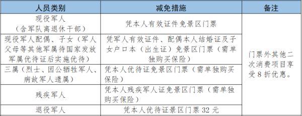 1.现役军人本人所携的配偶和18岁以下未成年子女,凭结婚证、户口本等有效证件实行门票免费或免预约;