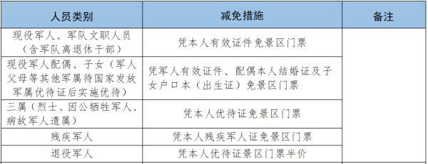 2.“三属”(烈士遗属、因公牺牲军人遗属、病故军人遗属)人员凭优待证实行门票免费或免预约;