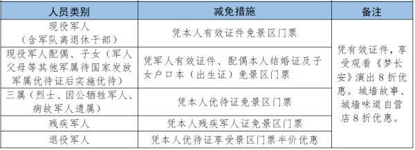 现役军人及随行家属(2位)三属(烈士、因公牺牲军人、病故军人遗属)退役军人(含军队离退休干部)、残疾军人可免费观看《夜谭·白鹿原》《黑娃演义》 《二虎守长安》 演出。