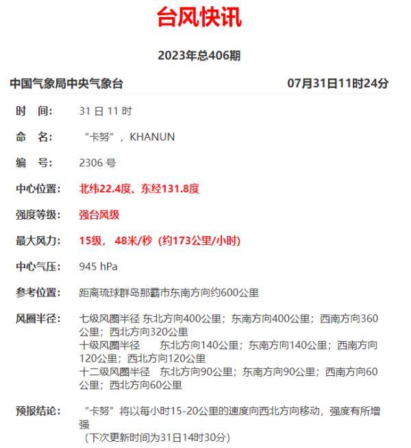 今年第6号台风“卡努”(KHANUN)已于今天(31日)上午由台风级加强为强台风级。
