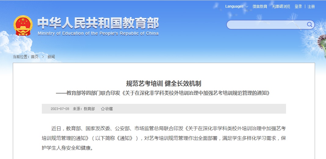 【环球网教育报道 记者 陈全】记者从教育部获悉,近日,教育部、国家发改委、公安部、市场监管总局联合印发《关于在深化非学科类校外培训治理中加强艺考培训规范管理的通知》(以下简称《通知》),对艺考培训规范管理作出全面部署,满足学生多样化学习需求,保护学生人身安全和健康。