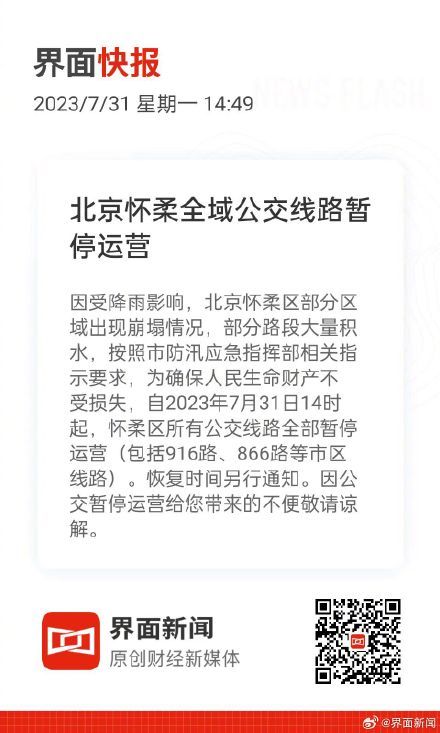 据@山水怀柔消息,因受降雨影响,北京怀柔区部分区域出现崩塌情况,部分路段大量积水,按照市防汛应急指挥部相关指示要求,为确保人民生命财产不受损失,自2023年7月31日14时起,怀柔区所有公交线路全部暂停运营(包括916路、866路等市区线路)。恢复时间另行通知。