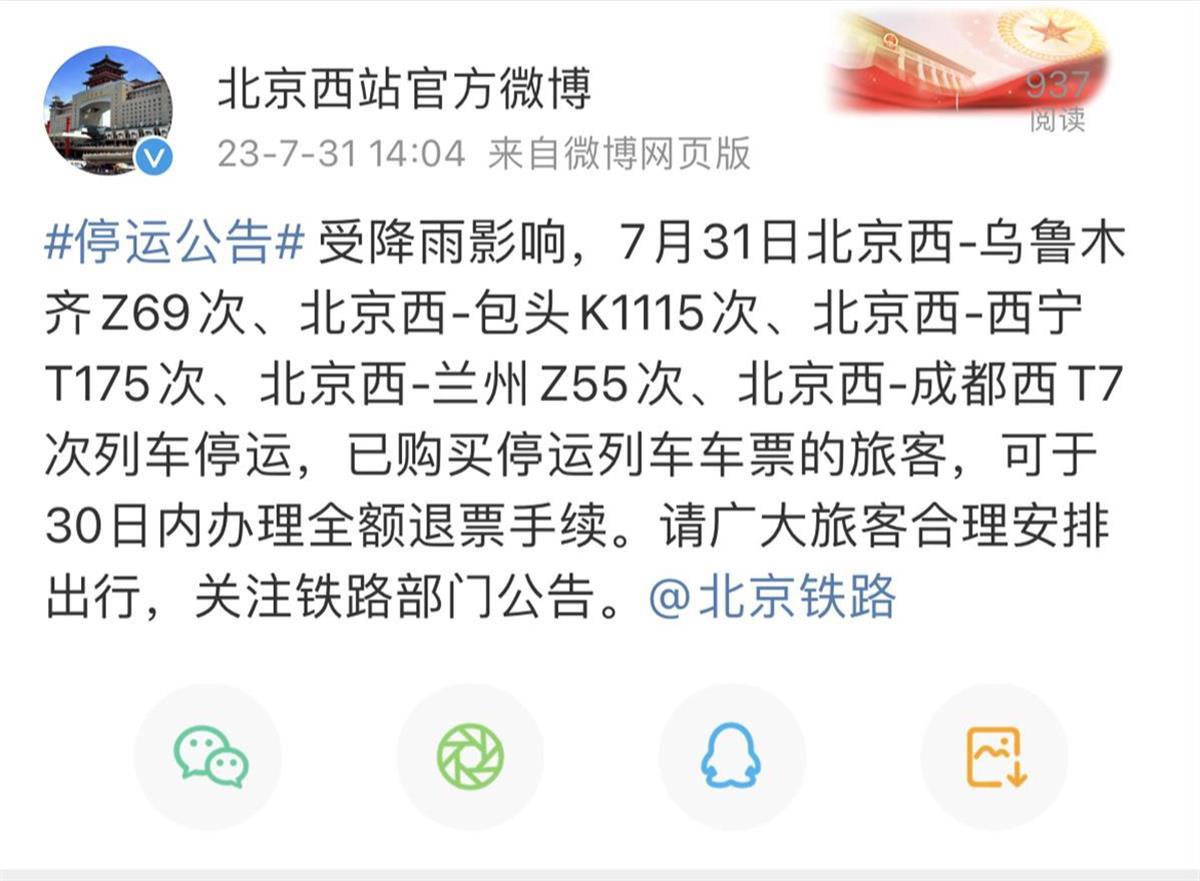 据了解,受降雨影响,多趟列车停运。31日,北京西站官方微博连发5条消息称,K89、K573、Z179、Z69、K1115、T175、Z55、T7次等多趟列车停运,已购买停运列车车票的旅客,可于30日内办理全额退票手续。