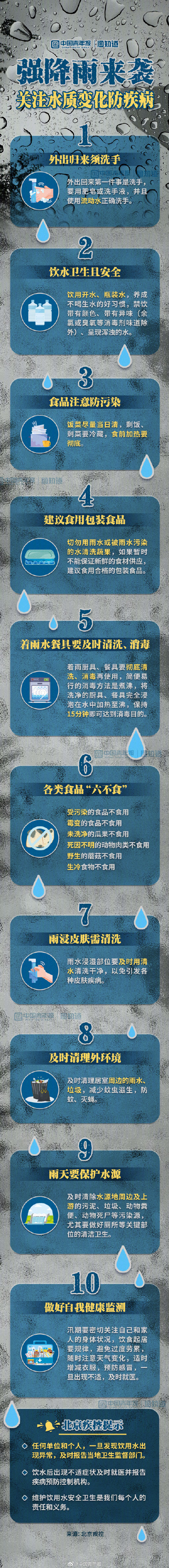 汛期来临,强降雨也可能带来各类健康问题。北京疾控今日发布汛期十大健康提示,尤其要关注饮水安全。疾控提醒:任何单位和个人,一旦发现饮用水出现异常,及时报告当地卫生监督部门。饮水后出现不适症状及时就医并报告疾病预防控制机构。