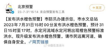 据@北京预警消息,北京市防汛办提示,市水文总站2023年7月31日15时00分发布洪水橙色预警,预计31日15时至17时,永定河流域永定河将出现橙色预警标准洪水,现升级发布洪水橙色预警。请市民远离河道,确保自身安全。