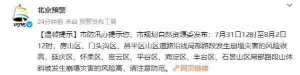 据北京预警7月31日消息,北京市规划自然资源委发布:7月31日12时至8月2日12时,房山区、门头沟区、昌平区山区道路沿线局部路段发生崩塌灾害的风险很高,延庆区、怀柔区、密云区、平谷区、海淀区、丰台区、石景山区局部路段山体斜坡发生崩塌灾害的风险高,请注意防范。