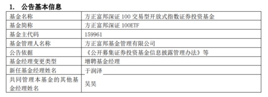 中国经济网北京7月31日讯 今日,方正富邦基金管理有限公司发布基金经理变更公告,方正富邦深证100ETF(159961)增聘基金经理于润泽。