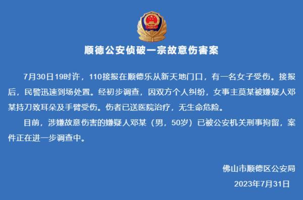 7月30日19时许,110接报在顺德乐从新天地门口,有一名女子受伤。接报后,民警迅速到场处置。经初步调查,因双方个人纠纷,女事主莫某被嫌疑人邓某持刀致耳朵及手臂受伤。伤者已送医院治疗,无生命危险。