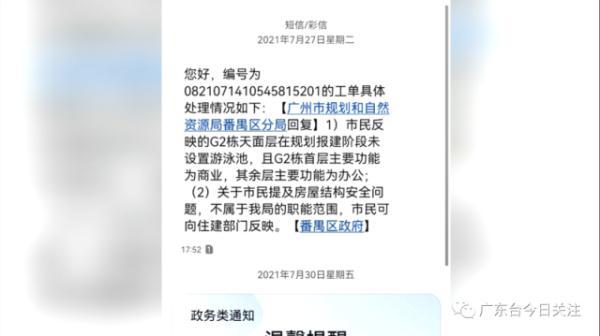 近日,相关媒体报道和群众反映广州市番禺区钟村街道“雄峰北商业中心”商业楼(自编G-2)楼顶建设游泳池的问题,我区高度重视,立即成立了由规划、住建、城管、消防等部门以及属地街道组成的联合工作组,本着“安全至上、依法依规”的原则迅速开展有关核查处理工作。