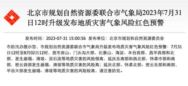 7月31日12时至8月02日12时,我市房山、门头沟大部,石景山、海淀、丰台西部,昌平西部和北部,发生崩塌、滑坡、泥石流等地质灾害的风险很高,延庆东南部和西北部,怀柔中部和南部,密云西部发生崩塌、滑坡等地质灾害的风险高;延庆北部、怀柔北部、密云东部和南部,平谷大部发生崩塌、滑坡等地质灾害的风险较高,请注意防范。