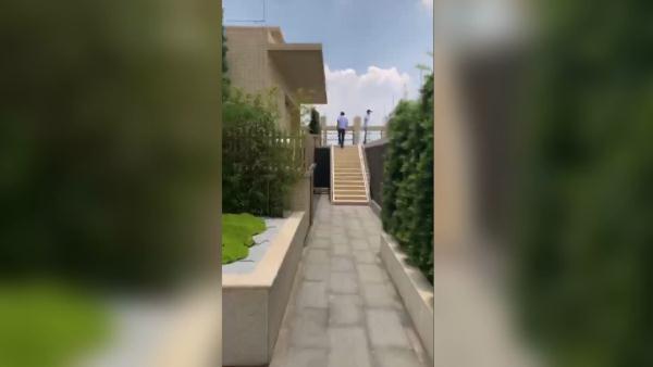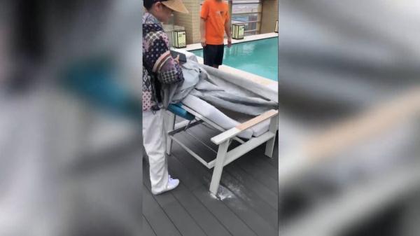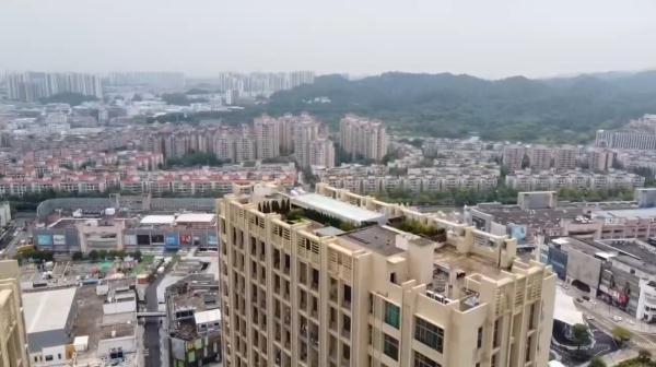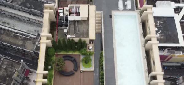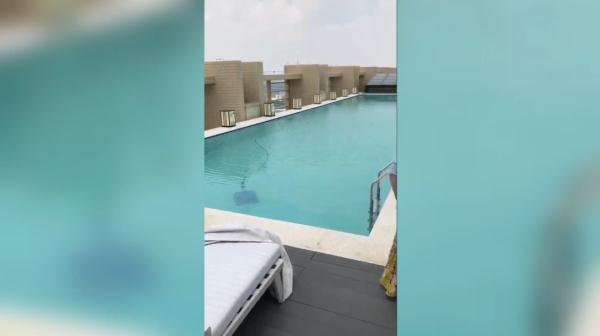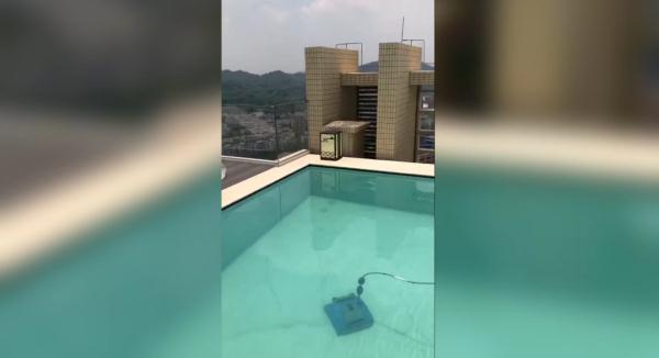 居民冉先生:上面已经建成了一个私人的豪华游泳池,还有更衣室、空中花园,园林绿化种的绿植非常多。我们量了一下(泳池),大概是8乘25米,深大概是2米。