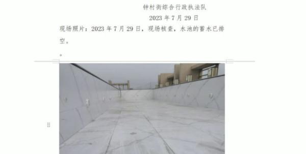 经现场勘查,“雄峰北商业中心”商业楼(自编G-2)楼顶水池不属于消防水池。目前,该水池已全部排空,消防通道已打开。