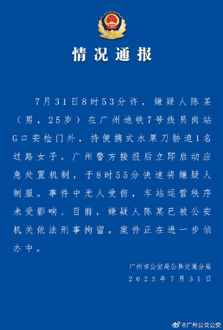 据@广州公交公安通报:7月31日8时53分许,嫌疑人陈某(男,25岁)在广州地铁7号线员岗站G口安检门外,持便携式水果刀胁迫1名过路女子。广州警方接报后立即启动应急处置机制,于8时55分快速将嫌疑人制服。事件中无人受伤,车站运营秩序未受影响。目前,嫌疑人陈某已被公安机关依法刑事拘留。案件正在进一步侦办中。