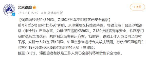 受今年第5号台风“杜苏芮”影响,京津冀地区持续强降雨,导致北京丰台至沙城铁路(丰沙线)严重水害,为确保在途的K396次、Z180次旅客列车安全,铁路部门及时联系当地政府,共同制定旅客转运方案。12时许,铁路工作人员会同当地村干部,安排专人前方探路引导,对重点旅客进行专人帮扶照顾,有序组织两趟列车滞留的1870名旅客和68名铁路乘务人员下车避险。