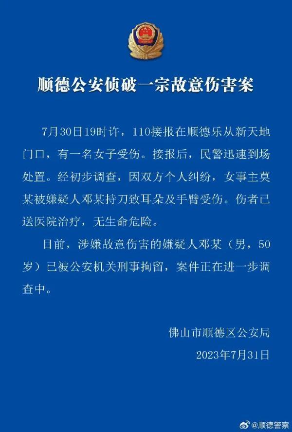 7月31日下午,广东佛山市顺德区公安局通报,7月30日19时许,110接报在顺德乐从新天地门口,有一名女子受伤。接报后,民警迅速到场处置。经初步调查,因双方个人纠纷,女事主莫某被嫌疑人邓某持刀致耳朵及手臂受伤。伤者已送医院治疗,无生命危险。