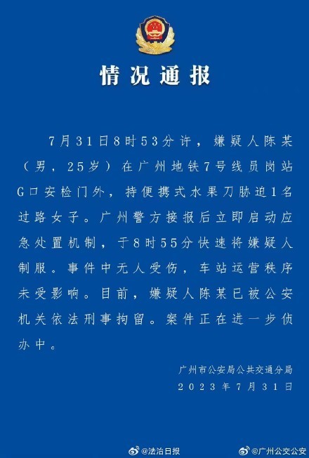 7月31日,广州市公安局公交分局发布消息,当天8时53分许,嫌疑人陈某(男,25岁)在广州地铁7号线员岗站G口安检门外,持便携式水果刀胁迫1名过路女子。广州警方接报后立即启动应急处置机制,于8时55分快速将该男子制服。警方通报称,事件中无人受伤,车站运营秩序未受影响。目前,嫌疑人陈某已被公安机关依法刑事拘留。案件正在进一步侦办中。(全媒体记者邓君)