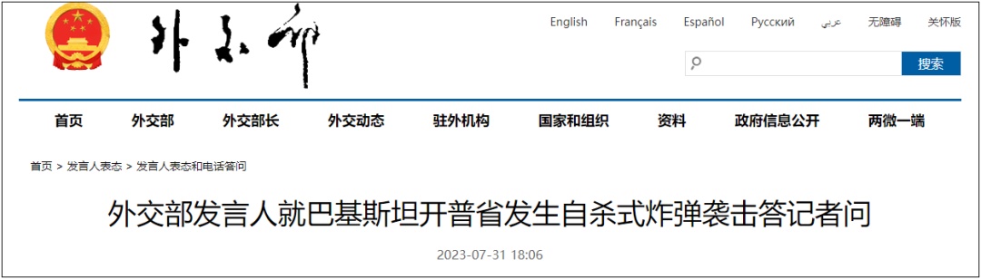 中国外交部发言人7月31日表示,中方对此次袭击事件深感震惊。中方坚决反对一切形式的恐怖主义,对此次针对平民的炸弹袭击予以强烈谴责,对遇难者表示哀悼,向遇难者家属和受伤人员表示慰问。中方坚定支持巴方推进国家反恐行动计划,坚持不懈致力于根除恐怖主义、实现社会稳定、保护人民生命安全。