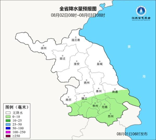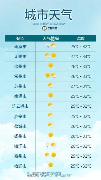 8月02日08时至8月03日08时:沿江及苏南地区多云到阴有分散性阵雨或雷雨,其他地区多云。最高温度全省32~33℃;最低温度本省东南部地区26~27℃,其他地区25℃左右。全省偏东风4-5级。