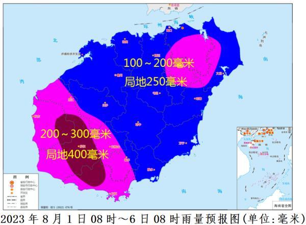 各地累积雨量(8月1日08时~6日08时):三亚、乐东、五指山、昌江和东方等市县200~300毫米、局地400毫米以上;其余市县100~200毫米、局地250毫米。
