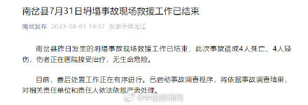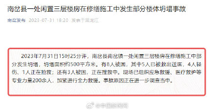 据“南岔发布”微信公众号消息:7月31日15时25分许,黑龙江南岔县南岔镇一处闲置三层楼房在修缮施工中部分发生坍塌,坍塌面积约500平方米。8月1日,坍塌事故现场救援工作已结束,此次事故造成4人死亡、4人轻伤,伤者正在医院接受治疗,无生命危险。(南岔发布)
