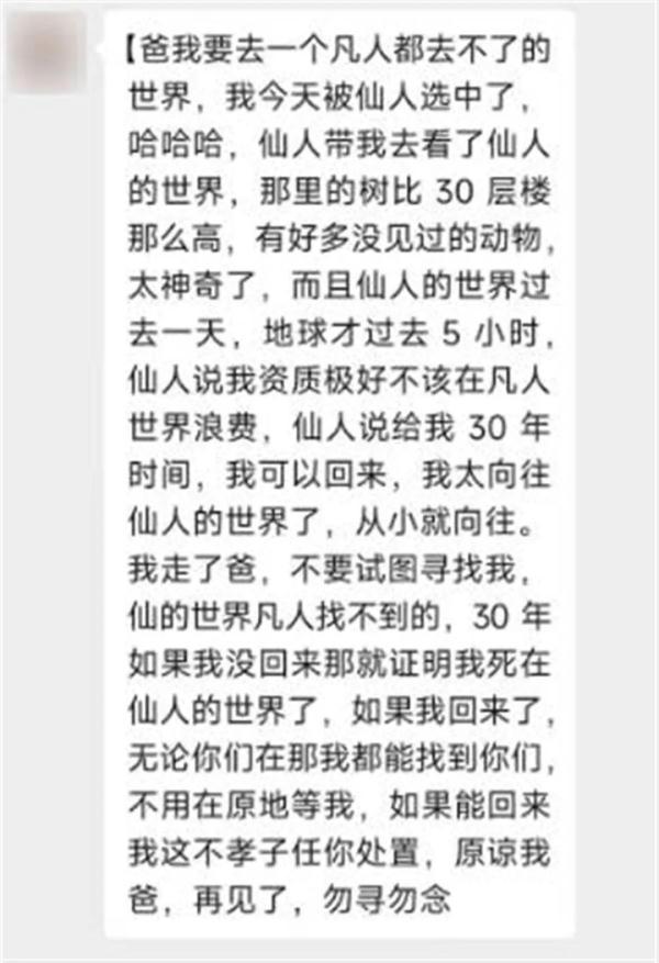 7月17日凌晨2时许,20岁的王蔚通过微信给爸爸王宗洪发送了一条诡异信息:“爸,我今天被仙人选中了,我要去一个凡人都去不了的世界,仙人说给我30年时间,我可以回来,如果30年后,我没有回来,那就证明我死在仙人的世界了,再见了,勿寻勿念!”