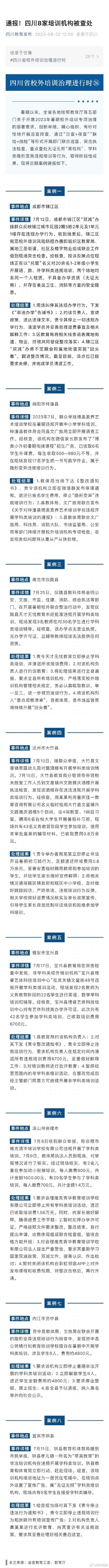 近日,四川省各地按照教育厅等五部门关于开展2023年暑期校外培训专项治理的部署要求,创新举措,精心组织、有针对性地开展巡查排查,通过“日查+夜查”“联检+抽检”等形式开展部门联合巡查、突击执法检查,重点查处无证无照“黑机构”、学科类隐形变异违规培训等行为,共8家暑期校外培训机构被查。