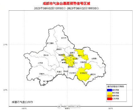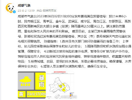 成都市气象台2023年08月02日13时00分发布暴雨黄色预警信号:预计未来6小时,成都市锦江区、青羊区、金牛区、武侯区、成华区、青白江区、东部新区、高新西区和高新南区的大部分乡镇(街道)降雨量将达50毫米以上。请注意防范暴雨、雷电和阵性大风带来的不利影响。