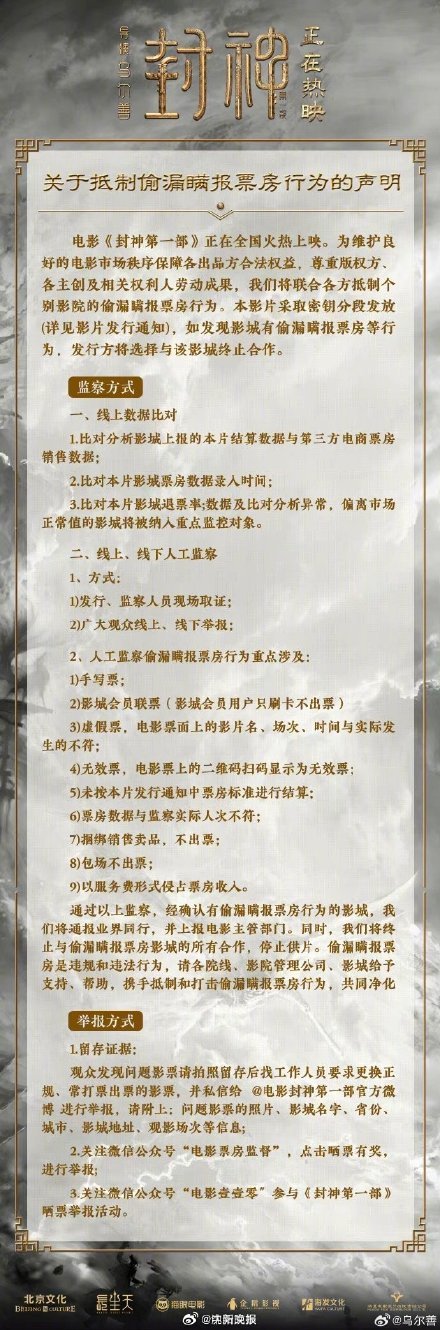最近,电影《封神第一部》的讨论度非常高,封神票房也持续受到关注。导演乌尔善近日发声明抵制偷漏瞒报票房行为。声明中称本影片采取密钥分段发放,如发现影城有偷漏瞒报票房等行为,发行方将选择与该影城终止合作。(中新文娱)