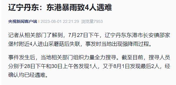 据央视新闻客户端消息,记者从相关部门了解到,7月27日下午,辽宁丹东东港市长安镇邵家堡村附近4人进山采蘑菇后失联,事发时当地出现强降雨过程。